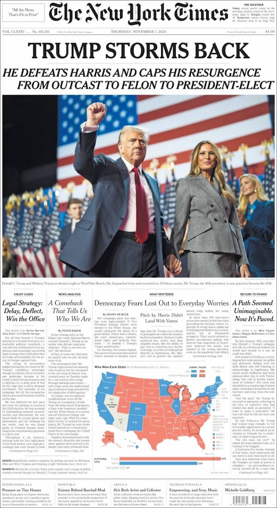 Su Majestad TheNew York Times dio la noticia del triunfo de Trump recordando en la bajada del título principal que el nuevo presidente es un forajido y un criminal.